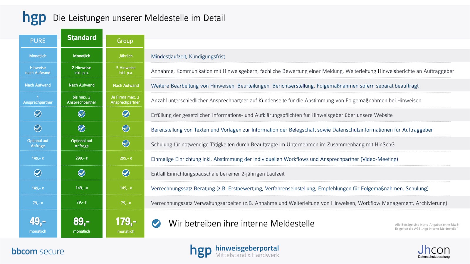 Dementsprechend haben wir im Tarif PURE auch keine Hinweise inkludiert, um Ihnen möglichst geringe Fixkosten zu ermöglichen. Hinweise werden im Tarif PURE nach Aufwand verrechnet. Als Erfahrungswert kann man für die Bearbeitung eines Hinweises durch hgp ca. 200 € ansetzen.